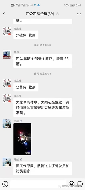 一是信息共享??偣就ㄟ^微信群、車內(nèi)監(jiān)控、GPS定位等手段,及時將線路運行情況、危險路段道路積水情況、場站排水情況等信息進(jìn)行共享聯(lián)動,以確保及時準(zhǔn)確下達(dá)工作指令。