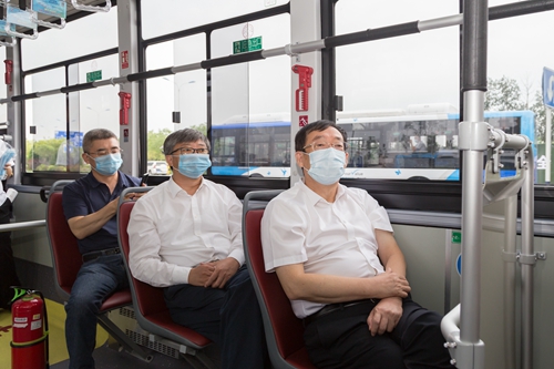 隨后,一行人登上公交車,總經理劉東占對新能源公交車的上線運營情況,充電站建設情況,新車電池續(xù)航里程、安全性等方面做了介紹。